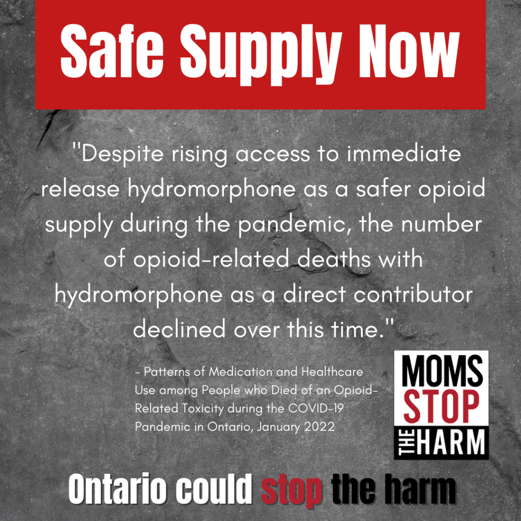 Long read Safe supply takes many forms. Hydromorphone is an opiate that physicians in Ontario may prescribe for people with Opioid Use Disorders. This gives people access to a regulated, known substance, instead of the tainted drug supply. Unfortunately, it’s very hard for people who need safe supply to get hydromorphone or other prescription-based safe drugs. Ontario needs to make hydromorphone more accessible. MSTH calls on Ontario’s health system leadership to improve access to hydromorphone. Read the full Ontario Public Health report released in January 2022 here; https://www.publichealthontario.ca/-/media/documents/c/2022/opioid-related-toxicity-deaths-healthcare-report.pdf?sc_lang=en